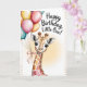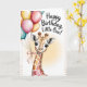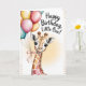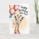 Cette adorable carte d'anniversaire présente une charmante petite girafe aux grands yeux expressifs et au doux sourire, sertie contre un arrière - plan pastel doux. La girafe est illustrée par des tons chauds d'orange, de crème et de brun, et semble tenir un paquet de ballons colorés (rose, rouge, jaune, turquoise et violet) attachés ensemble avec un ruban rose.