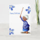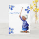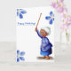 Carte d'anniversaire mignonne avec une femme noire plus âgée tenant une canne. Le design est complété par des fleurs d'aquarelle bleue. Illustré et dessiné par Patricia Alvarez.