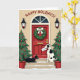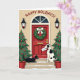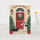 This special picture on the card shows a classic holiday scene. 🎅🏼🎄🎁 In the middle, there's a cozy red door with a pretty green wreath and a white bow. On each side, there are two big Christmas trees with lots of green leaves and red decorations. The trees look like they're covered in snow, matching the snow falling against the light brown wall. Above, there are cool black lanterns with touches of red light. At the top, the words "HAPPY HOLIDAYS!" are written nicely. Downstairs, there's a cute black cat with a red collar and a friendly dog holding a white envelope. The whole picture feels happy and wintery, perfect for the holidays. It's like a warm, inviting storybook scene that makes you feel good. 🎅🏼🎄🎁 This card is perfect for spreading holiday joy!