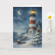 Brille une lumière sur la magie des vacances avec cette carte de Noël enchanteresse. Un phare rayé rouge et blanc brille chaleureusement sous un ciel étoilé d'hiver, avec des pins enneigés, une couronne festive et un canot décoré le long du rivage.