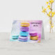 Carte de vœux avec une photo appétissante représentant une pile de macarons colorés.