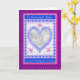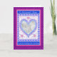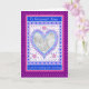 Une jolie carte photo d'anniversaire de mariage avec des cœurs et des fleurs dans un motif semblable à une couverture piquée, en bleu, argent, rose et violet. Ajoutez votre propre photo et votre propre texte à l'intérieur et sur la couverture ; d'après un dessin peint à la main par Judy Adamson.