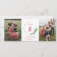 Un carte photo de Noël moderne avec un monogramme familial unique, deux ouvertures verticales ou portraitiennes avec une couronne de fil doré et un swag de vacances asymétrique avec branches de pin, cyprès et baies sur un arrière - plan blanc enneigé.