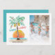 Carte photo de Noël à thème tropical plat avec une île au soleil avec un palmier décoré de lampes à cordes et d'ornements et un accueil "happy holiday" avec un espace pour remplacer l'exemple de photo par le vôtre. Art par KL Stock