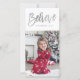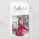 Ce modèle de carte photo de vacances saisonnière présente un fond blanc hivernal avec une police de caractères lettrage à la main lisant "Believe" en faux foil argenté.