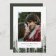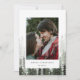 Carte de vacances en forêt de pin vert foncé et rustique conçue par Shelby Allison et pouvant être personnalisée avec une photo et un texte à l'avant ainsi qu'une photo et un message d'accueil à l'arrière.