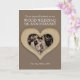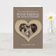 carte photo d'anniversaire de mariage en bois 5 ans. Personnalisez cette carte d'anniversaire de mariage 5 ans avec effet bois brun avec votre relation, photo et années de mariage, et message à l'intérieur de la carte. L'exemple indique : À ma chère épouse pour notre anniversaire de mariage en bois le 25 mai 2024 à 2029. Art et design de cœur en bois sculpté par Sarah Trett pour www.mylittleeden.com
