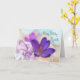 Carte d'anniversaire avec une belle photo d'un crocus violet foncé serti dans un pot en verre. Une légère fleur violette est présente dans l'arrière - plan.