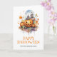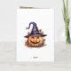 Carte d'Halloween à l'aquarelle personnalisée avec des jack-o-lanternes, des feuilles en chute et une maison hantée sur le devant et un citrouille portant un casquette violet à l'arrière. Personnalisez facilement cette belle carte d'Halloween aquarelle avec votre nom de famille, photo et texte.