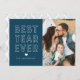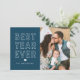 Envoyez à vos proches une carte de vœux photo élégante pour cette période des fêtes ! La carte photo moderne présente un fond marine, la phrase "Meilleure Année" dans une police tendance, des espaces réservés pour votre texte et photo personnalisés, et un motif géométrique marine et blanc au verso de la carte.