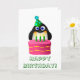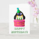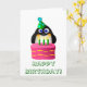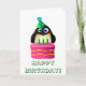 Un mignon pingouin de dessin animé avec un casquette à taches vertes, et un grand gâteau d'anniversaire rose éclairé par trois bougies vertes. Un grand cadeau pour un troisième anniversaire - ou n'importe quel anniversaire d'amoureux des pingouins!