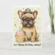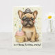 L'adorable French Bulldog, habillé en pirate bouillonnant au crâne et aux os croisés, casquette et carré d'oeil, célébrant avec un cupcake gelé rose et allumé une bougie contre un arrière - plan de confetti festif. Cette charmante illustration présente le texte "Arr! Joyeux anniversaire, matey!" parfait pour les fêtes d'anniversaire et les amoureux de les chiens.