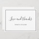 Modifiez l'avant et l'arrière de la carte pour remplacer nos exemples de détails par les vôtres, et supprimez sans remplacer le texte si vous préférez un aspect plus simple. Le message « Love and thanks » sur le devant, écrit dans un script manuscrit, utilise une lettre majuscule « L » uniquement pour le premier mot, mais vous pouvez changer cela et mettre toutes les lettres en minuscules, ou garder la lettre majuscule « L » dans « Love » et mettre également le « t » dans « thanks » en majuscule, si vous préférez. Ou vous voudrez peut-être changer cette partie du design et afficher un message différent à cet endroit. Vous pouvez changer la couleur et la police du texte, ainsi que la taille du texte, et vous pouvez également changer la couleur de fond de chaque côté pour l'adapter à vos goûts. Nous avons défini le fond des deux côtés comme transparent pour que la couleur du papier serve simplement de ton de base. Le texte sur le devant ainsi que la bordure sont noirs par défaut, et le texte en bas du verso de la carte est d'un gris très foncé qui est presque noir. Vous préférerez peut-être supprimer le texte au verso sans le remplacer par vos propres informations, en laissant le verso vide.