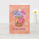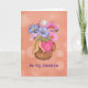 "Fleurs pour ma Valentine" présente un bouquet de petites fleurs délicates, enveloppées dans du jute. Le bouquet comporte des fleurs roses et bleues et l'étiquette en forme de cœur indique "Je t'aime". Le texte sur le devant et à l'intérieur peut être personnalisé.