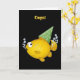 Un adorable poisson rouge caricaturé portant un casquette d'anniversaire, pensant "Oups !"