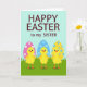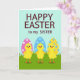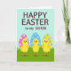Designed with a pale blue background, this Easter card opens with deep crimson text across the top that reads “HAPPY EASTER to my SISTER,” with the first words larger and the rest tucked neatly beneath. Below the lettering, three small yellow baby birds stand side by side, their tiny orange beaks and feet turned slightly toward one another as if sharing a friendly moment. Each bird has a simple dark eye and a soft, content look that adds a gentle, caring tone to the scene. Behind them sit three large egg shapes like seasonal decorations, arranged in a row to frame the birds. The left egg is pink with white polka dots, the middle egg is light blue with darker blue dots, and the right egg is yellow with light blue spots, keeping a cheerful pattern throughout 🌷. Along the bottom, a wavy strip of rich green grass anchors the birds and eggs like a small spring meadow 🐰. The eggs rise above the grass in smooth ovals, with evenly spaced dots that echo across all three colors.