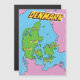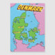 Une carte stylisée du Danemark dans un style pop art, avec un contour vert du pays contre un arrière - plan à pointillés bleu et rose. La carte met en évidence les grandes villes aux étiquettes jaunes rectangulaires, dont Aalborg, Aarhus, Esbjerg, Odense, Copenhague et Lolland.