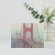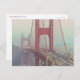 L'image montre une vue partielle du Golden Gate Bridge à San Francisco, couvert de brouillard. La couleur rouge-orange caractéristique du pont est visible, en contraste avec le brouillard gris. On voit des voitures conduire sur le pont. L'arrière - plan présente des collines floues et du ciel à cause du brouillard. L'ambiance générale est atmosphérique et un peu mystérieuse.