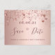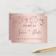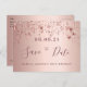 Une carte féministe et glamour Save the Date pour une fête de 100e anniversaire 100 ans. Un arrière - plan rose féminin, rose d'or faux métallique à l'aspect décoré d'étoiles brillantes d'or faux rose. Modèles pour une date et votre texte. Lettres de couleur or rose foncé. Le texte : Save the Date est écrit avec un grand script de style à la main tendance. Retour : arrière - plan rose d'or. Modèles pour les détails de votre fête. Texte noir.