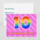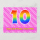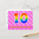 Le devant de cette conception de carte postale sur le thème d'anniversaire joyeux, gai et heureux comporte un grand nombre "10" ayant un motif dégradé de spectre d'arc-en-ciel. Il comporte également le message "Joyeux 10ème anniversaire" et un nom de destinataire personnalisable. Le devant comporte en outre un motif rayé rose foncé et rose clair joyeux avec des formes de cœur. Le verso comporte un message de vœux d'anniversaire personnalisé, ou pourrait éventuellement être effacé et laissé vide si un message doit être écrit à la main à la place. Une carte postale d'anniversaire personnalisée comme celle-ci pourrait être une façon amusante de célébrer le dixième anniversaire de quelqu'un. Des cartes postales comme celle-ci pourraient également être utilisées pour inviter des invités à une fête d'anniversaire organisée pour quelqu'un qui a 10 ans