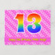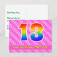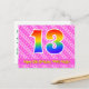 Le devant de cette conception de carte postale à thème d'anniversaire aimante, heureuse et joyeuse présente un grand nombre "13" avec un motif dégradé à spectre arc-en-ciel. Il comporte également le message "Joyeux 13e anniversaire," et un nom de destinataire modifiable. Le devant comporte en outre un motif rayé rose foncé et rose clair joyeux contenant des formes de cœur. Le verso comporte un message de vœu d'anniversaire personnalisé, ou pourrait éventuellement être effacé et laissé vide si un message doit être écrit à la main à la place. Une carte postale d'anniversaire personnalisée comme celle-ci pourrait être un moyen amusant de célébrer le treizième anniversaire de quelqu'un. Des cartes postales comme celle-ci pourraient également être utilisées pour inviter des invités à une fête d'anniversaire organisée pour quelqu'un qui a 13 ans.