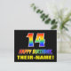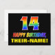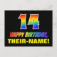 La façade de cette carte postale colorée, joyeuse et amusante à thème d'anniversaire comporte un grand nombre de "14" et le message "HAPPY BANTHDAY", tous deux ayant un dégradé arc-en-ciel inspiré couleur motif, ainsi qu'un nom de destinataire personnalisé jaune gras. L'avant a aussi un arrière - plan noir clair. Le verso de la carte postale contient un message de voeux d'anniversaire modifiable, ou peut-être peut-être être effacé et laissé vide si un message doit être écrit à la main à la place. Une carte postale d’anniversaire personnalisable comme celle-ci pourrait être une façon amusante de reconnaître le quatorzième anniversaire de quelqu’un. [~Z0000474]