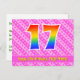 L'avant de cette conception de carte postale sur le thème d'anniversaire amusante, joyeuse et heureuse présente un grand nombre "17" ayant un motif inspiré d'un dégradé de spectre d'arc-en-ciel. Il comporte également le message "Joyeux 17e anniversaire," et un nom de destinataire personnalisé. L'avant présente en outre des formes de cœur rose foncé et rose clair joyeuses et un motif de rayures. Le verso comporte un message de vœu d'anniversaire personnalisé, ou pourrait éventuellement être effacé et laissé vide si un message doit être écrit à la main à la place. Une carte postale d'anniversaire personnalisée comme celle-ci pourrait être un moyen amusant d'envoyer un message pour célébrer le dix-septième anniversaire de quelqu'un. Des cartes postales comme celle-ci pourraient également être utilisées pour inviter des invités à une