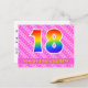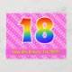 Le recto de cette carte de vœux d'anniversaire joyeuse, pleine d'entrain et de gaieté présente un grand numéro "18" avec un motif inspiré d'un dégradé de spectre d'arc-en-ciel. Il comporte également le message "Joyeux 18ème anniversaire" et un nom de destinataire personnalisé. Le recto présente en outre un motif joyeux composé de cœurs et de rayures de couleur rose clair et rose foncé. Le verso comporte un message de vœux d'anniversaire modifiable, ou pourrait éventuellement être effacé et laissé vide si un message doit être écrit à la main à la place. Une carte de vœux d'anniversaire personnalisable comme celle-ci pourrait être un moyen amusant d'envoyer un message pour célébrer le dix-huitième anniversaire de quelqu'un. Des cartes postales comme celle-ci pourraient également être utilisées pour inviter des