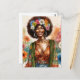 This postcard features a vibrant watercolor painting of an African American woman with an afro hairstyle adorned with colorful flowers. She is wearing a floral top, an olive green cardigan, and denim pants, accessorized with hoop earrings and a belt.