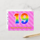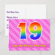 Le recto de cette carte postale d'anniversaire joyeuse, pleine d'entrain et de bonne humeur présente un grand nombre "19" avec un motif inspiré d'un dégradé de spectre d'arc-en-ciel. Il comporte également le message "Joyeux 19e anniversaire" et un nom de destinataire personnalisé. Le recto présente en outre des cœurs de couleur rose foncé et rose clair et un motif rayé joyeux. Le verso comporte un message de vœux d'anniversaire personnalisé, ou pourrait éventuellement être laissé en blanc si un message doit être écrit à la main à la place. Une carte postale d'anniversaire personnalisée comme celle-ci pourrait être un moyen amusant de souhaiter un joyeux anniversaire à quelqu'un. Des cartes postales comme celle-ci pourraient également être utilisées pour inviter des invités à une fête d'anniversaire organisée pour quelqu'un
