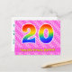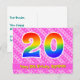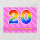 L'avant de cette carte postale sur le thème d'anniversaire joyeuse, gaie et aimante comporte un grand nombre "20" avec un motif inspiré d'un dégradé de spectre d'arc-en-ciel, ainsi que le message "Joyeux 20e anniversaire" et un nom de destinataire personnalisable. L'avant comporte en outre un motif rayé rose clair et rose foncé contenant des formes de cœur. Le verso comporte un message de vœu d'anniversaire personnalisable, ou pourrait éventuellement être effacé et laissé vide si un message doit être écrit à la main à la place. Une carte postale d'anniversaire personnalisable comme celle-ci pourrait être un moyen amusant d'envoyer un message pour célébrer le vingtième anniversaire de quelqu'un. Des cartes postales comme celle-ci pourraient également être utilisées pour inviter des invités à une célébration d'anniversaire ou à