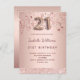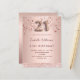 Une invitation moderne, élégante et glamour pour une fête de 21e anniversaire. Un arrière - plan métallique à l'apparence rose à l'or rose et aux étoiles à gouttes roses. Le nom est écrit avec un rose moderne de couleur or foncé à la main écriture style. Personnalisez et ajoutez les détails de votre fête. Le numéro 21 est écrit avec une police de style ballon, script. Retour : arrière - plan or rose, design carte postale. Conseil : Si vous ne voulez pas qu'il ressemble à une carte postale, cliquez sur customiser, allez à l'arrière et retirez le séparateur et le timbre postal.
