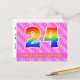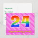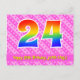 Le devant de cette carte d'anniversaire joyeuse, aimante et gaie présente un grand nombre "24" avec un motif dégradé de spectre d'arc-en-ciel, ainsi que le message "Joyeux 24e anniversaire" et un nom de destinataire personnalisable. Le devant comporte également un motif de cœurs et de rayures de couleur rose foncé et rose clair joyeux. Le verso comporte un message de vœux d'anniversaire personnalisé, ou pourrait éventuellement être effacé et laissé vierge si un message doit être écrit à la main à la place. Une carte d'anniversaire personnalisable comme celle-ci pourrait être un moyen amusant de célébrer le vingt-quatrième anniversaire de quelqu'un. Des cartes postales comme celle-ci pourraient également être utilisées pour inviter des invités à une célébration d'anniversaire ou une fête organisée pour quelqu'un qui a 24 ans. [
