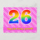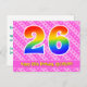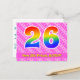 L'avant de cette conception de carte postale sur le thème d'anniversaire amusante, heureuse et joyeuse présente un grand nombre "26" avec un motif dégradé de spectre d'arc-en-ciel, ainsi que le message "Joyeux 26e anniversaire" et un nom de destinataire modifiable. L'avant présente également un motif rayé rose clair et rose foncé contenant des formes de cœur. Le verso comporte un message de vœux d'anniversaire personnalisé, ou pourrait éventuellement être effacé et laissé vide si un message doit être écrit à la main à la place. Une carte postale d'anniversaire personnalisable comme celle-ci pourrait être un moyen amusant de célébrer le vingt-sixième anniversaire de quelqu'un. Des cartes postales comme celle-ci pourraient également être utilisées pour inviter des invités à une célébration d'anniversaire ou une fête organisée pour quelqu'un qui