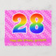 Le recto de cette carte postale de joyeux anniversaire, au thème affectueux, joyeux et heureux, présente un grand nombre "28" avec un motif inspiré d'un dégradé de spectre d'arc-en-ciel, ainsi que le message "Joyeux 28e anniversaire" et un nom de destinataire personnalisable. Le recto présente en outre un motif joyeux composé de cœurs et de rayures de couleur rose foncé et rose clair. Le verso présente un message de vœux d'anniversaire personnalisable, ou pourrait éventuellement être effacé et laissé vide si un message doit être écrit à la main à la place. Une carte postale d'anniversaire personnalisable comme celle-ci pourrait être un moyen amusant de célébrer le vingt-huitième anniversaire de quelqu'un. Des cartes postales comme celle-ci pourraient également être utilisées pour inviter des invités à une fête d'annivers