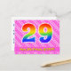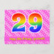 L'avant de cette conception de carte postale à thème d'anniversaire amusante, dynamique et joyeuse présente un grand nombre "29" avec un motif dégradé de spectre d'arc-en-ciel, ainsi que le message "Joyeux 29e anniversaire" et un nom de destinataire personnalisé. L'avant présente également des cœurs de couleur rose foncé et rose clair et un motif de rayures. Le verso comporte un message de vœux d'anniversaire personnalisé, ou pourrait éventuellement être effacé et laissé vide si un message doit être écrit à la main à la place. Une carte postale d'anniversaire personnalisée comme celle-ci pourrait être un moyen amusant d'envoyer un message pour célébrer le vingt-neuvième anniversaire de quelqu'un. Des cartes postales comme celle-ci pourraient également être utilisées pour inviter des invités à une fête d'anniversaire ou à une célébr