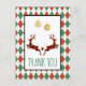 Une carte de Noël qui dit "Merci" sur le devant et comporte un message personnalisé au dos. Conçue avec une illustration de 2 cerfs de Noël sautants. Les cerfs sont faits de carreaux de bûcheron rouges et noirs, avec un petit cœur entre eux. De fausses décorations de Noël en paillettes d'or pendent vers le bas depuis le haut. Le fond est un motif à carreaux rouge et vert.