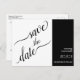 Ces cartes postales de mariage sauvegardent la date avec un style unique et élégant 2 volet avec une calligraphie de script élégante sur la gauche et des détails de texte simple sur la droite. Les couleurs noir et blanc rendent le design à la fois simple et audacieux.