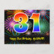 Le recto de cette carte d'anniversaire excitante, colorée et amusante présente un grand nombre "31" avec un motif dégradé de spectre arc-en-ciel, ainsi que le message "Joyeux 31e anniversaire" et un nom de destinataire personnalisé. Le recto comporte également un motif de fond vibrant et coloré inspiré de l'aspect de feux d'artifice de célébration qui éclatent. Le verso comporte un message d'anniversaire personnalisé ou pourrait éventuellement être effacé et laissé vierge si un message doit être écrit à la main à la place. Une carte d'anniversaire personnalisée comme celle-ci pourrait être un moyen amusant d'envoyer un message pour célébrer le trente-et-unième anniversaire de quelqu'un. Des cartes comme celle-ci pourraient également être utilisées pour inviter des invités à une fête ou une célébration d'anniversaire organisée pour quelqu'un