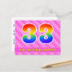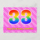 Le recto de cette carte d'anniversaire joyeuse, amusante et entraînante présente un grand nombre "33" avec un motif dégradé de spectre d'arc-en-ciel. Il comporte également le message "Joyeux 33e anniversaire" et un nom de destinataire personnalisé. Le recto présente en outre des cœurs de couleur rose foncé et rose clair joyeux et un motif de rayures. Le verso comporte un message d'anniversaire personnalisé ou pourrait éventuellement être laissé en blanc si un message doit être écrit à la main à la place. Une carte d'anniversaire comme celle-ci pourrait être un moyen amusant d'envoyer des vœux d'anniversaire à quelqu'un qui célèbre son trente-troisième anniversaire. Des cartes comme celle-ci pourraient également être utilisées pour inviter des invités à une fête d'anniversaire organisée pour quelqu'un qui va avoir 33 ans. [~