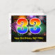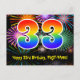 L'avant de cette conception de carte postale d'anniversaire colorée, amusante et excitante présente un grand nombre "33" ayant un motif dégradé de spectre d'arc-en-ciel. Il comporte également le message "Joyeux 33e anniversaire" et un nom de destinataire modifiable. L'avant présente en outre un motif de fond vibrant et coloré inspiré de l'apparence de feux d'artifice de célébration éclatés. Le verso comporte un message de vœu d'anniversaire personnalisable, ou pourrait éventuellement être effacé et laissé vide si un message doit être écrit à la main à la place. Une carte postale d'anniversaire comme celle-ci pourrait être un moyen amusant d'envoyer des vœux d'anniversaire à quelqu'un qui célèbre son trente-troisième anniversaire. Des cartes postales comme celle-ci pourraient également être utilisées pour inviter des invités