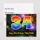 Le devant de cette carte d'anniversaire excitante, amusante et colorée présente un grand nombre "34" avec un motif dégradé de spectre arc-en-ciel. Elle comporte également le message "Joyeux 34e anniversaire" et un nom de destinataire modifiable. Le devant comporte en outre un motif de fond coloré et vibrant inspiré de l'apparence de feux d'artifice de célébration qui éclatent. Le verso comporte un message de vœux d'anniversaire modifiable, ou pourrait éventuellement être effacé et laissé vide si un message doit être écrit à la main à la place. Une carte d'anniversaire personnalisable comme celle-ci pourrait être un moyen amusant de célébrer le trente-quatrième anniversaire de quelqu'un. Des cartes postales comme celle-ci pourraient également être utilisées pour inviter des invités à une fête d'anniversaire organisée pour quelqu'un qui a 34 ans