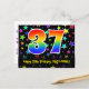 Le recto de cette carte postale d'anniversaire amusante, excitante et colorée présente un grand nombre "37" avec un motif dégradé de spectre d'arc-en-ciel, ainsi que le message "Joyeux 37e anniversaire" et un nom de destinataire modifiable. Le recto présente en outre un motif de fond d'étoiles colorées et vibrantes. Le verso comporte un message de vœux d'anniversaire personnalisé, ou pourrait éventuellement être effacé et laissé vierge si un message doit être écrit à la main à la place. Une carte postale d'anniversaire comme celle-ci pourrait être un moyen amusant d'envoyer des vœux d'anniversaire à quelqu'un qui célèbre son trente-septième anniversaire. Des cartes postales comme celle-ci pourraient également être utilisées pour inviter des invités à une célébration d'anniversaire ou à une fête organisée pour