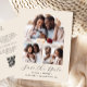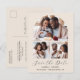 Cette carte postale simple et minimaliste Save the Date présente un collage en forme d'arc de trois photos au-dessus des mots "Save the Date" dans un élégant script d'écriture noire, suivi des noms du couple, date mariage et ville en sans serif police sur un arrière - plan beige. Ajoutez votre adresse de retour et des détails supplémentaires au verso, ainsi qu'un code QR pour aider vos invités à visiter votre site Web mariage.