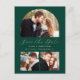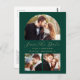 Cette carte postale simple et minimaliste Save the Date comprend une photo en arc en haut et deux petites photos carrés en bas. Au milieu, les mots "Save the Date" apparaissent dans un élégant script d'écriture dorée, suivi des noms du couple, date mariage et ville en sans serif police sur un arrière - plan vert émeraude. Ajoutez votre adresse de retour ainsi que des détails supplémentaires au verso.