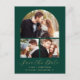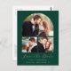 Cette carte postale simple et minimaliste Save the Date présente un collage en forme d'arc de trois photos au-dessus des mots "Save the Date" dans un élégant script d'écriture manuscrite couleur or, suivi des noms du couple, date mariage et ville en sans serif police sur un arrière - plan vert émeraude. Ajoutez votre adresse de retour et des détails supplémentaires au verso, ainsi qu'un code QR pour aider les clients à visiter votre site Web mariage.