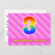 L'avant de cette conception de carte postale sur le thème d'anniversaire heureuse, joyeuse et optimiste comporte un grand nombre "3" avec un motif inspiré d'un dégradé de spectre d'arc-en-ciel, ainsi que le message "Joyeux 3e anniversaire" et un nom de destinataire personnalisable. L'avant comporte en outre un motif rayé rose foncé et rose clair joyeux contenant des formes de cœur. Le verso comporte un message de vœux d'anniversaire modifiable, ou pourrait éventuellement être effacé et laissé vide si un message doit être écrit à la main à la place. Une carte postale d'anniversaire personnalisée comme celle-ci pourrait être une façon amusante d'envoyer un message pour célébrer le troisième anniversaire de quelqu'un. Des cartes postales comme celle-ci pourraient également être utilisées pour inviter des invités à une célébration d'annivers