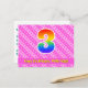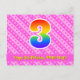 L'avant de cette carte postale joyeuse, gaie et optimiste à l'occasion d'un anniversaire présente un grand chiffre "3" avec un motif dégradé de spectre arc-en-ciel, ainsi que le message "Joyeux 3ème anniversaire" et un nom de destinataire personnalisable. L'avant comporte également un motif rayé rose foncé et rose clair joyeux contenant des formes de cœur. Le verso comporte un message de vœux d'anniversaire modifiable, ou pourrait éventuellement être effacé et laissé vide si un message doit être écrit à la main à la place. Une carte postale d'anniversaire personnalisée comme celle-ci pourrait être un moyen amusant d'envoyer un message pour célébrer le troisième anniversaire de quelqu'un. Des cartes postales comme celle-ci pourraient également être utilisées pour inviter des invités à une célébration d'anniversaire ou une fête organisée pour quelqu'un