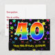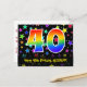 Le devant de cette conception de carte postale thématique d'anniversaire colorée, amusante et excitante présente un grand nombre "40" avec un motif dégradé à spectre arc-en-ciel. Elle comporte également le message "Joyeux 40e anniversaire" et un nom de destinataire personnalisé. Le devant présente en outre un motif vibrant et coloré de formes d'étoiles. Le verso comporte un message de vœux d'anniversaire personnalisé, ou pourrait éventuellement être effacé et laissé vide si un message doit être écrit à la main à la place. Une carte postale d'anniversaire personnalisable comme celle-ci pourrait être un moyen amusant d'envoyer un message pour célébrer le quarantième anniversaire de quelqu'un. Des cartes postales comme celle-ci pourraient également être utilisées pour inviter des invités à une fête ou à une célébration d'anniversaire organisée pour quelqu'un qui a