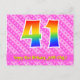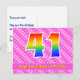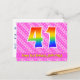 Le devant de cette conception de carte postale thématique d'anniversaire amusante, dynamique et affectueuse comporte un grand nombre "41" avec un motif dégradé de spectre d'arc-en-ciel, ainsi que le message "Joyeux 41e anniversaire" et un nom de destinataire personnalisé. Le devant comporte également un motif rayé rose clair et rose foncé avec des formes de cœur. Le verso comporte un message de vœux d'anniversaire modifiable, ou pourrait éventuellement être effacé et laissé vide si un message doit être écrit à la main à la place. Une carte postale d'anniversaire personnalisable comme celle-ci pourrait être un moyen amusant de célébrer le quarante et unième anniversaire de quelqu'un. Des cartes postales comme celle-ci pourraient également être utilisées pour inviter des invités à une célébration d'anniversaire ou une fête organisée pour quelqu'un qui a